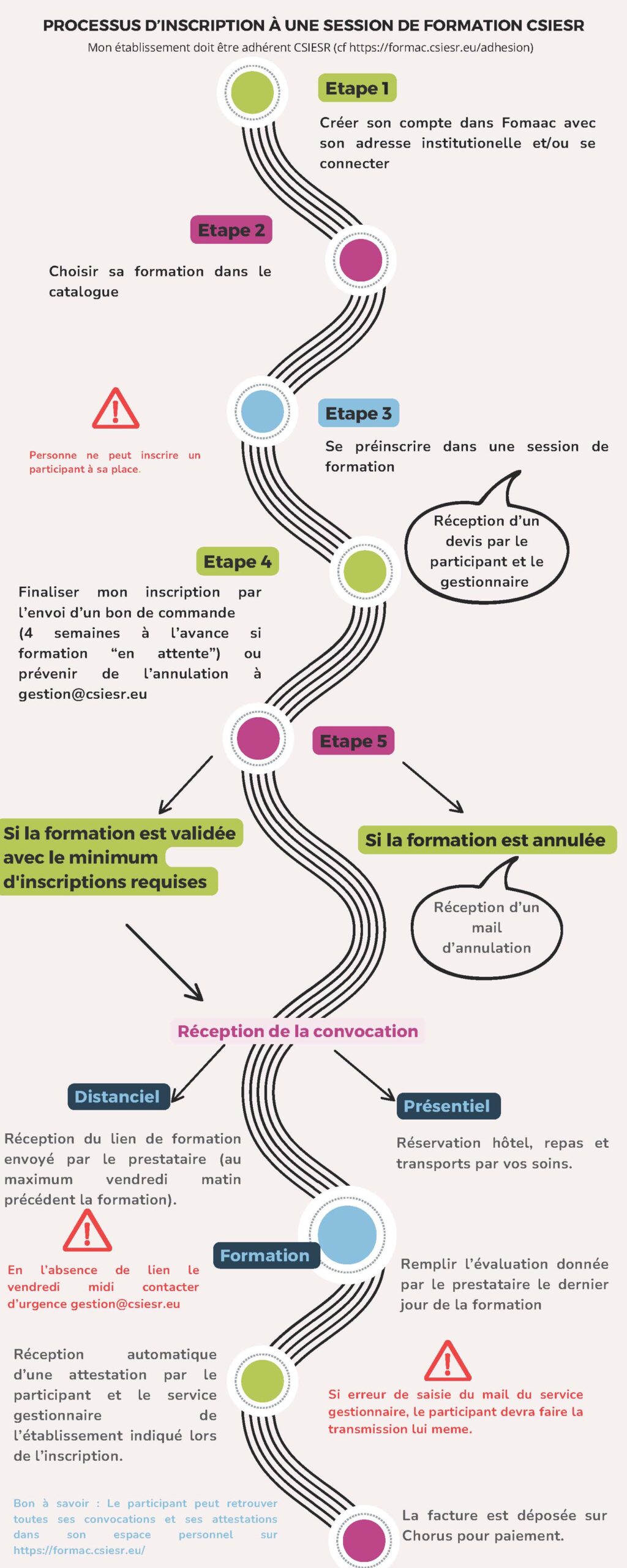 Les formations sont réservées aux adhérents du CSIESR. Nous appliquons un tarif “subventionné” pour les établissements sous tutelle du ministère de l’Enseignement Supérieur et de la Recherche. L’inscription individuelle à une formation se déroule en plusieurs étapes selon le processus suivant :